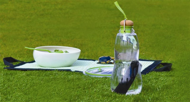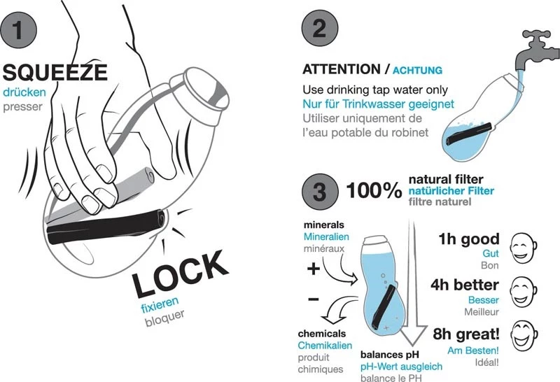 - butelka przeznaczona do filtrowania pitnej wody z kranu (pochłania jony chloru i zanieczyszczenia, ale uwalnia m. in. żelazo, wapń, magnez),