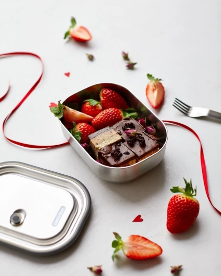 Lunchbox wykonany ze stali nierdzewnej i wyposażony w silikonowy pasek przytrzymujący,