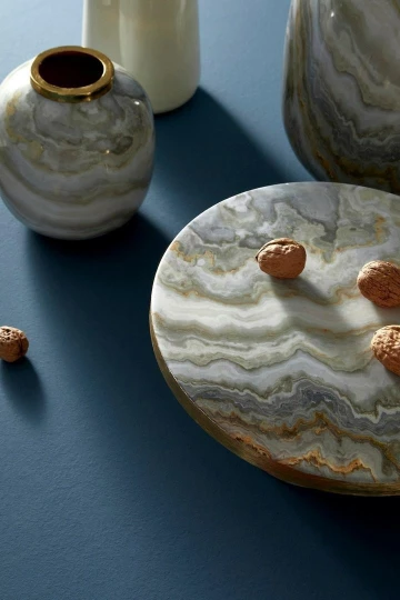 Wykonany ręcznie z metalu, charakteryzuje się subtelną paletą barw – odcieniami beżu, szarości i złota, które pięknie współgrają ze sobą, tworząc efekt naturalnego kamienia. Akcent w kolorze złota dodaje całości luksusowego charakteru. Ze względu na ręczne wykonanie, każdy egzemplarz jest unikalny, a drobne różnice kolorystyczne czy strukturalne stanowią atut, nadający niepowtarzalnego uroku.