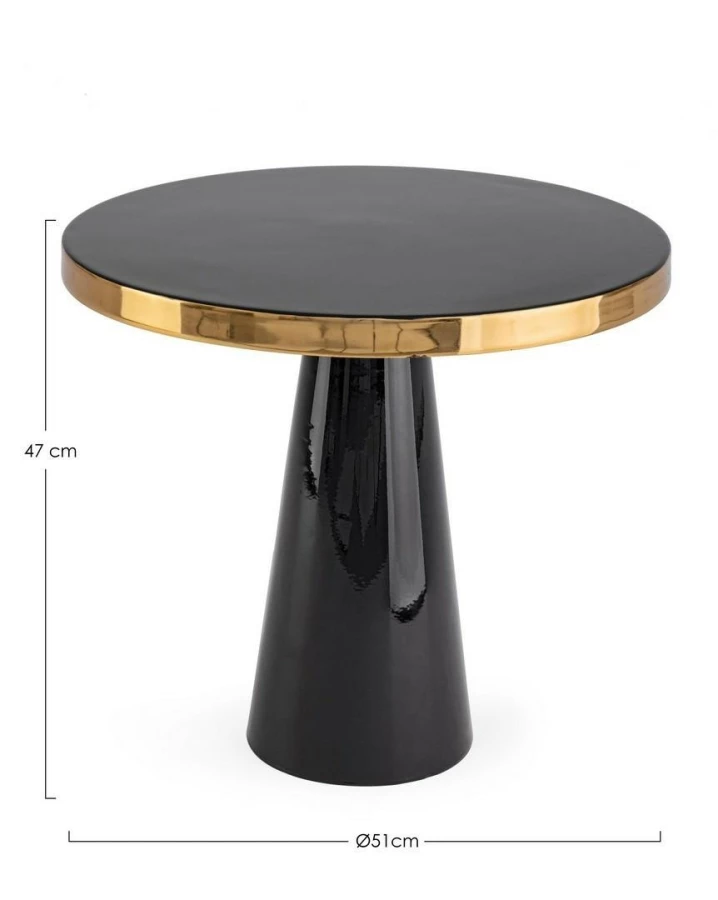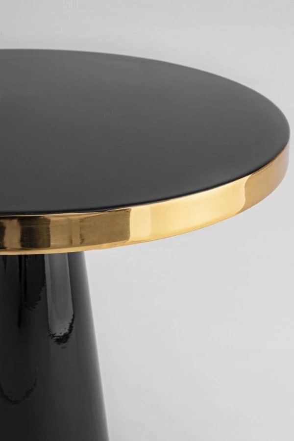 Górna krawędź blatu ozdobiona jest mosiężnym wykończeniem, które kontrastuje z głęboką czernią i dodaje stolikowi wyjątkowego charakteru.