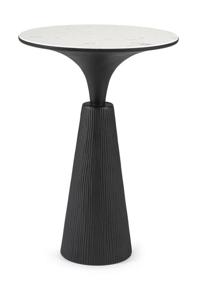Blat wykonany z marmuru w jasnym, białym odcieniu z naturalnymi szaro-brązowymi żyłkami stanowi doskonały kontrast dla ciemnej podstawy, podkreślając ekskluzywność projektu. Stolik wpisuje się w nowoczesne, minimalistyczne wnętrza, ale równie dobrze sprawdzi się w aranżacjach w stylu glamour lub loftowym.