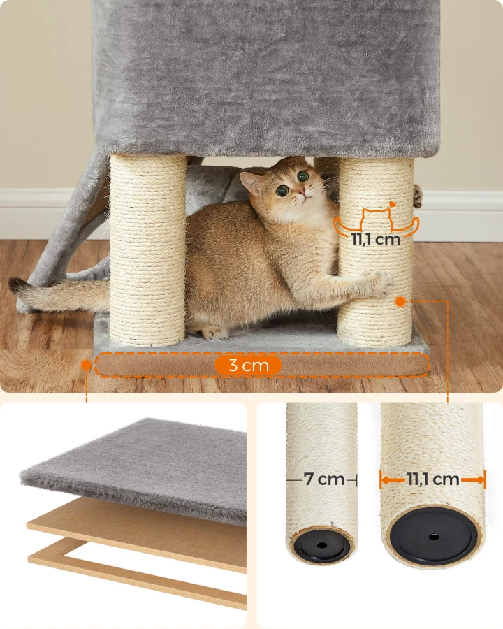 Może być używany jednocześnie przez kilka kotów, a słupek owinięty liną sizalową pozwoli zachować ostre pazury chroniąc meble przed zadrapaniami.