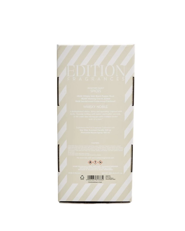 Dyfuzor zapachowy z rattanowymi patyczkami o pojemności 200 ml. Francuska kompozycja zapachowa złożona z wielu nut na bazie naturalnych olejków o wysokim stężeniu. Wysokiej jakości szkło oraz nasadka z bukowego drewna malowanego na satynowy czarny kolor. Edycja Whisky Nobile to zapach z mocnym charakterem słodowej whisky i pikantnych przypraw w otoczeniu eleganckiej skóry i drewna sandałowego.