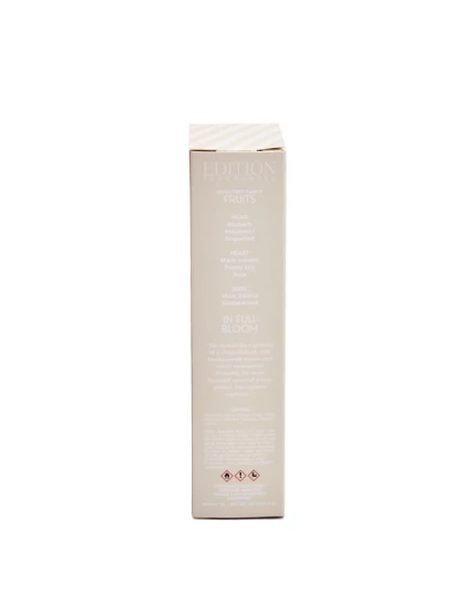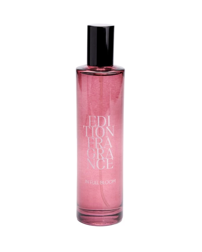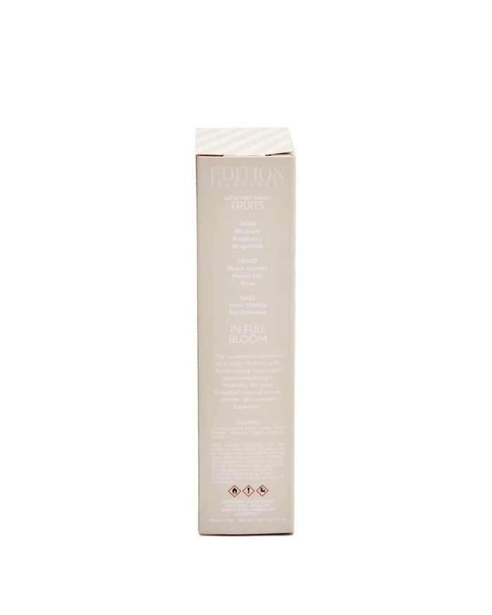 Perfumy do wnętrz o pojemności 100 ml. Francuska kompozycja zapachowa złożona z wielu nut na bazie naturalnych olejków o wysokim stężeniu na poziomie eau de parfum. Wysokiej jakości barwione szkło oraz nasadka w czarnym kolorze. Edycja In Full Bloom to soczyste nuty rabarbaru i czerwonych owoców na subtelnych płatkach róży otoczonych piżmem i delikatną wanilią. Nie mogą być stosowane jako perfumy do ciała.