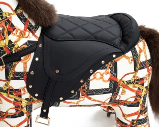 Stylizowany na eleganckiego konika, zachwyca wzorzystą tkaniną inspirowaną jeździeckimi motywami oraz dbałością o detale - od pikowanego, czarnego siodła, przez miękką brązową futrzaną grzywę, po drewniane uchwyty. Osadzony na kółkach, jest nie tylko wygodnym siedziskiem, ale też mobilnym towarzyszem dziecięcych przygód.