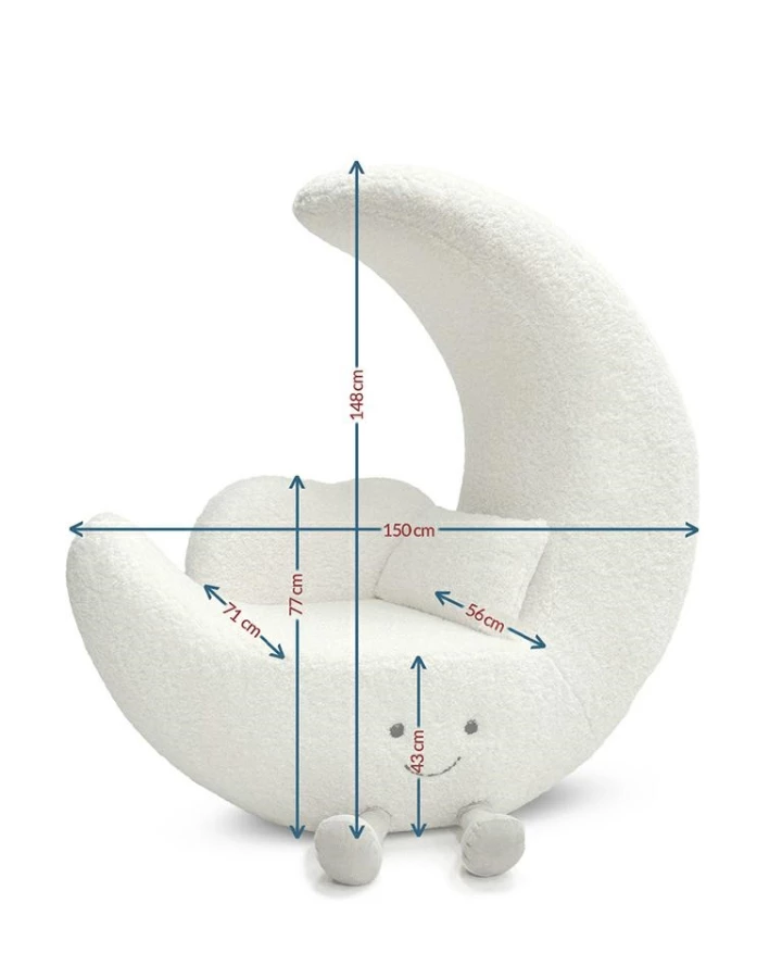 Uroczy i komfortowy fotel w kształcie księżyca, zaprojektowany z myślą o dziecięcych pokojach i przestrzeniach wypoczynkowych.