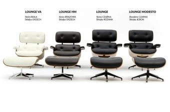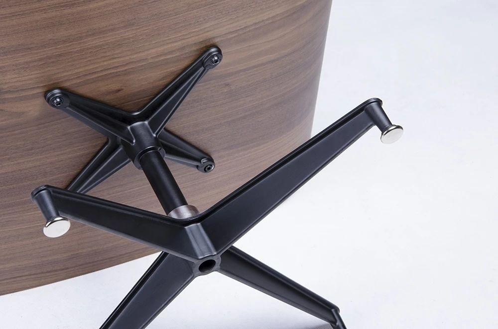 Cały fotel wraz z podnóżkiem tapicerowane są naturalną włoską skórą w kolorze czarnym. Zarówno korpus fotela, jak i podnóżka zostały wykonane