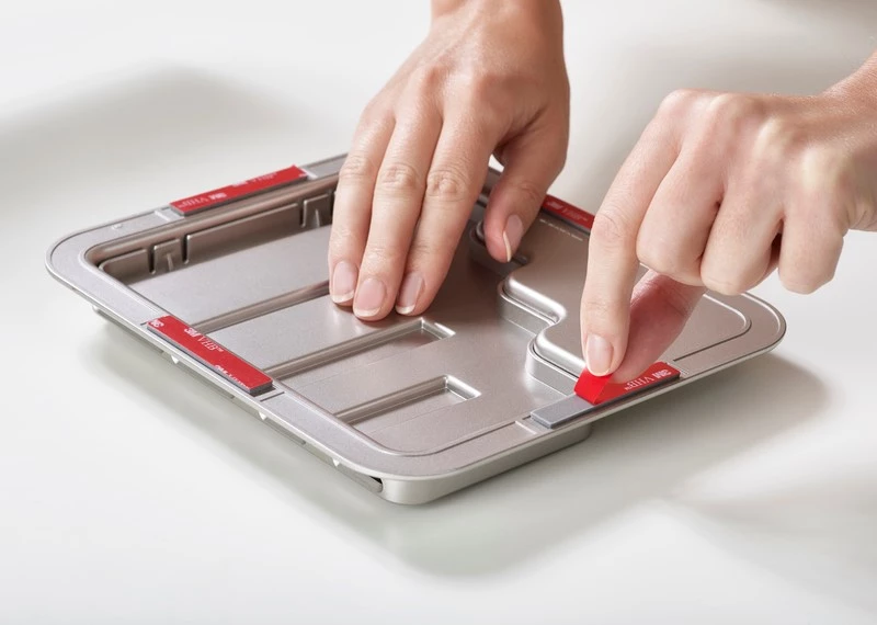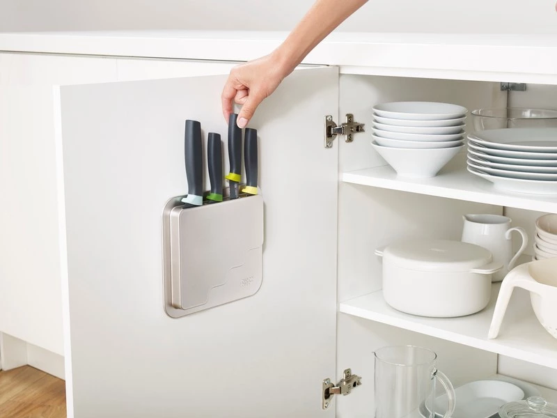 - zestaw 4 noży umieszczonych w bloku montowanym do wewnętrznej strony drzwiczek kuchennych (za pomocą taśmy klejącej 3M VHB) – niezwykła oszczędność miejsca,