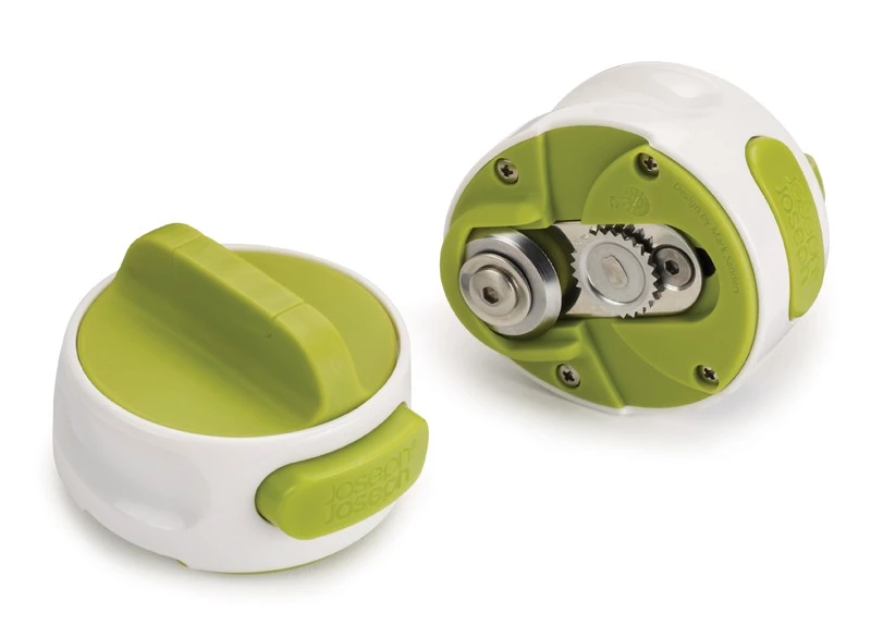Kompaktowy otwieracz z białego i zielonego tworzywa sztucznego. Można nim szybko i łatwo otworzyć każdą puszkę. Posiada duże pokrętło – wystarczy go przekręcać, aby spodni nożyk otworzył puszkę. Naciśnięcie przedniego przycisku powoduje zwolnienie pokrywy. Bezpieczny – pokrywki otworzonych puszek nie mają postrzępionych krawędzi. Łatwy do przechowywania w szufladach.