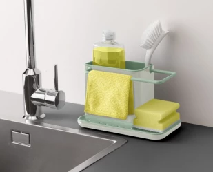 Pojemnik na akcesoria do zmywania pozwala na organizację akcesoriów do zmywania.Duży pojemnik na płyn do mycia naczyń i szczotkę. Specjalny wieszak na wilgotną ściereczkę, oraz miejsce na gąbkę z odpływem dzięki czemu gąbka schnie, a woda zbiera się w zbiorniczku pod nią. Cały pojemnik można z łatwością rozłożyć do mycia. Idealne rozwiązanie jeżeli wokół zlewu nie ma za wiele miejsca.