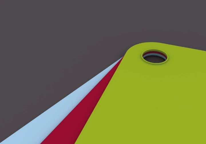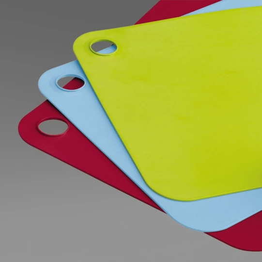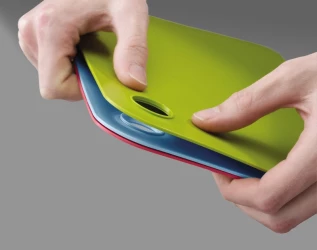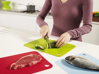 Zestaw trzech desek do krojenia w trzech kolorach. Zielona do krojenia warzyw, niebieska do ryb i czerwona do mięsa. Wszystkie maty można spiąć razem. Otwór pozwala na zawieszenie desek. Nałeży czyścić ręcznie.