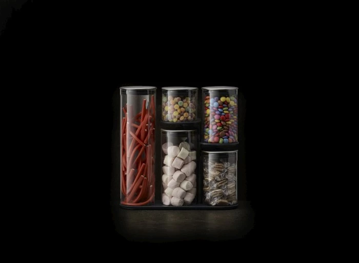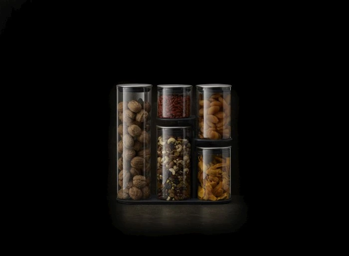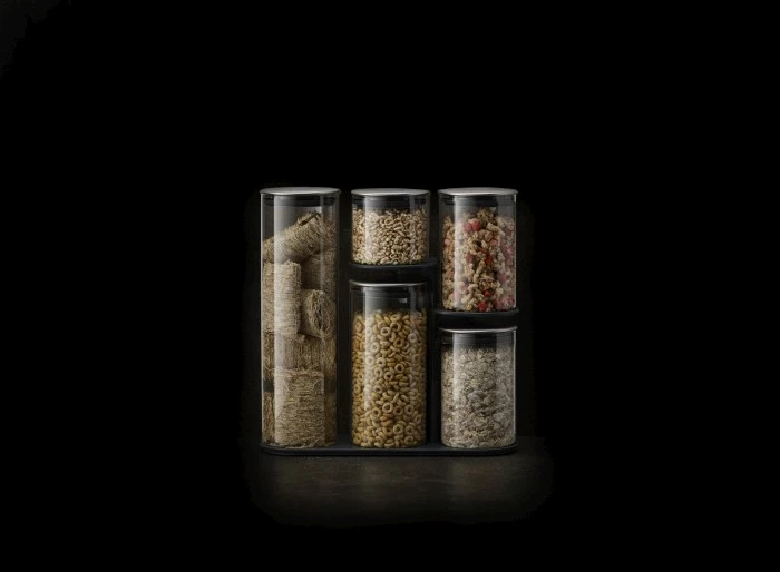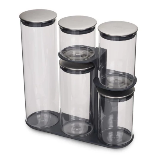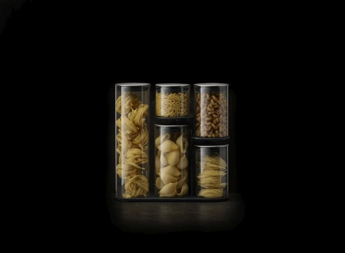 - zestaw pojemników na np. makaron, mąkę, ryż, cukier itp. umieszczonych na stojaku,
