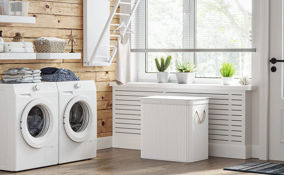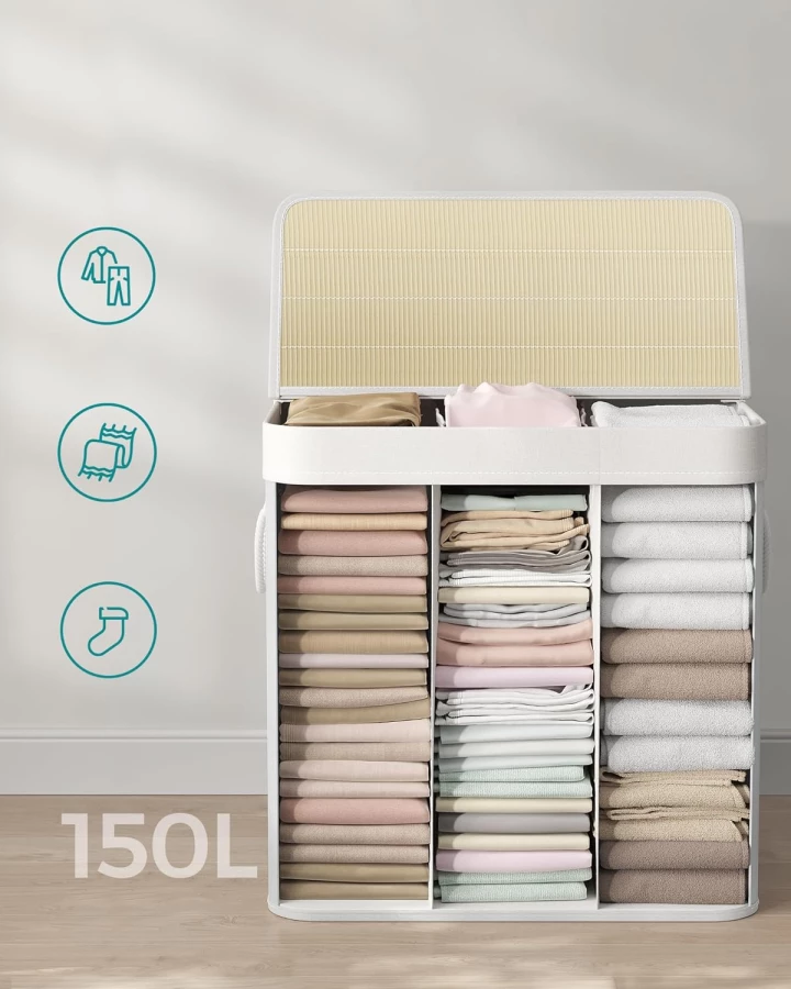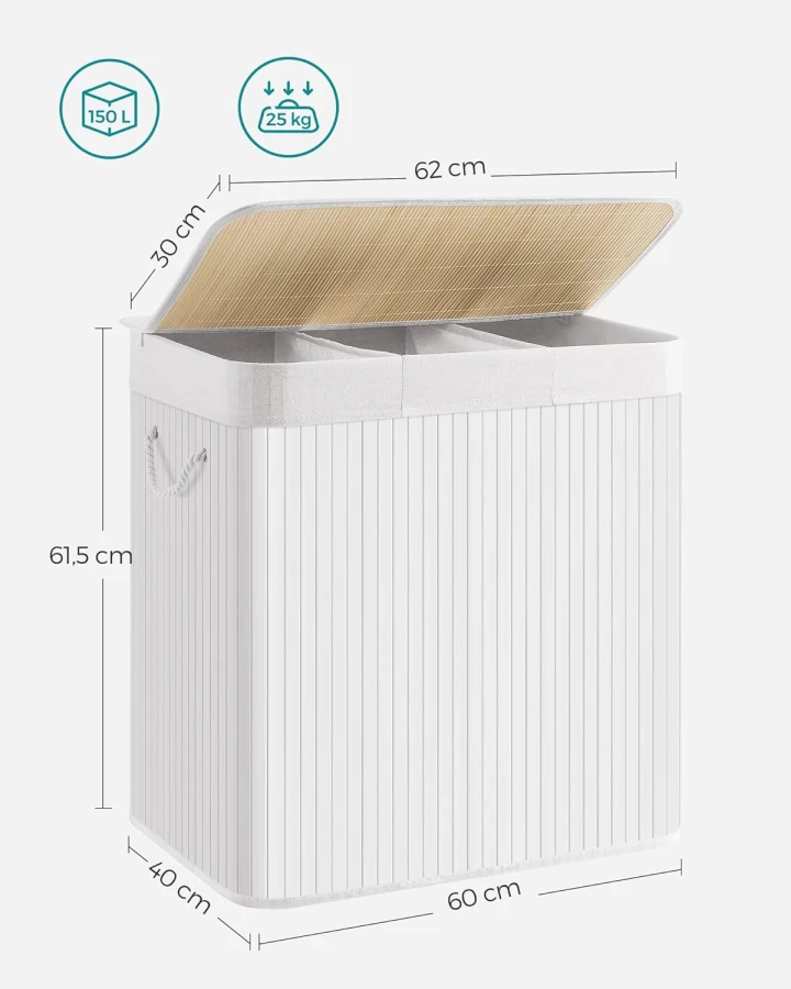 BAMBUSOWY KOSZ NA PRANIE, BIELIZNĘ, POJEMNIK NA ZABAWKI TRZYKOMOROWY, BIAŁY, 3 x 50L