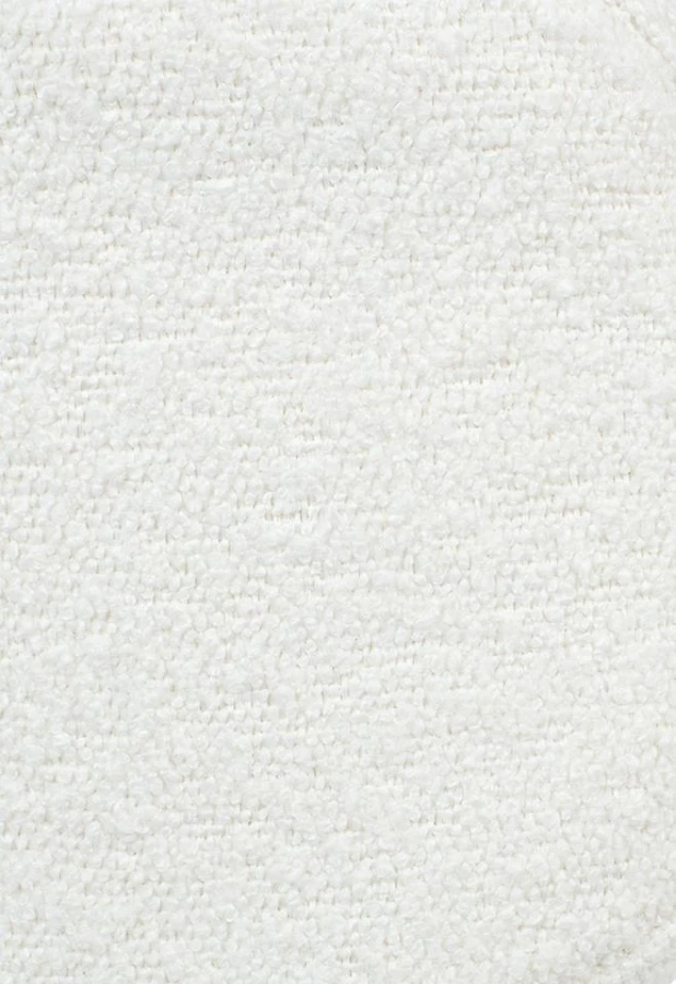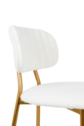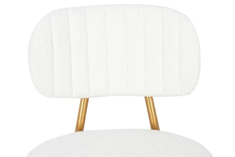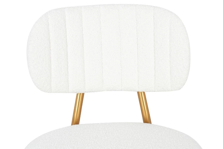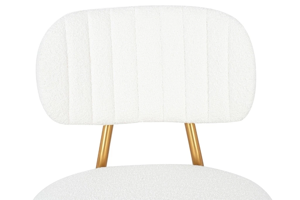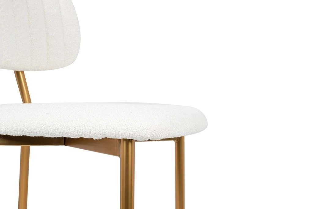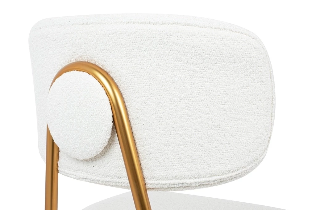Oparcie i siedzisko tapicerowane są przyjemną, miękką w dotyku tkaniną boucle w kolorze białym.