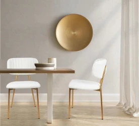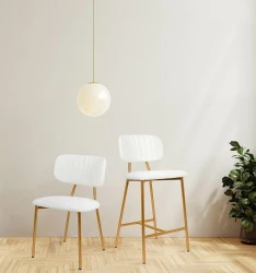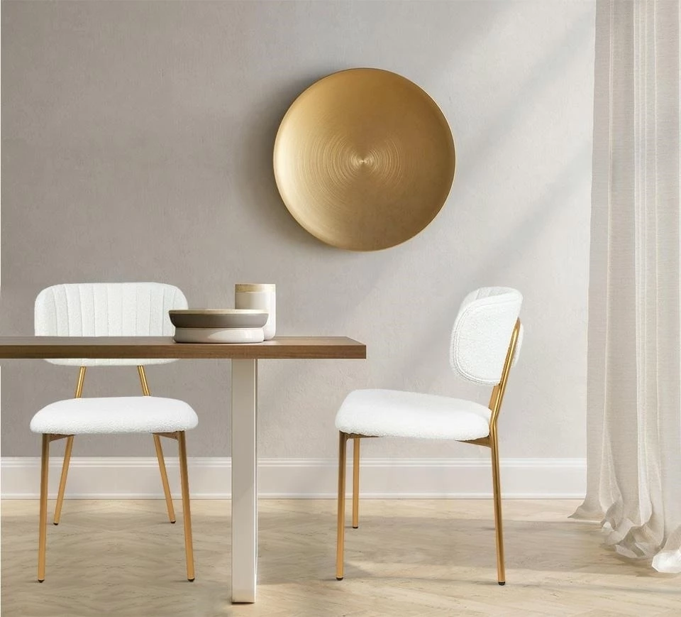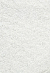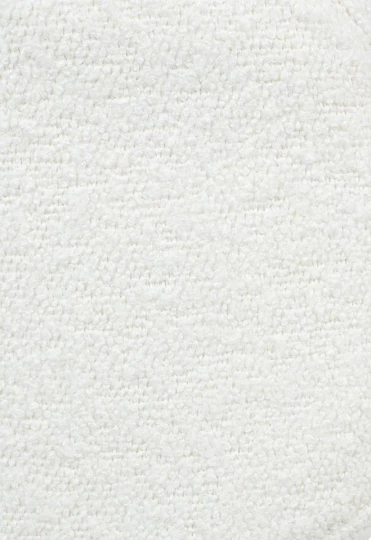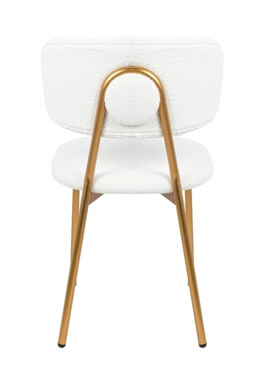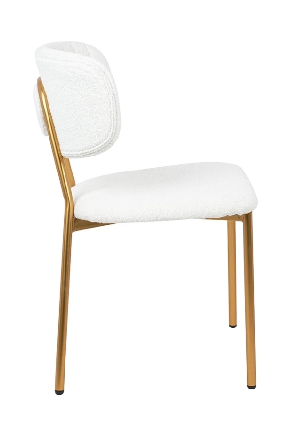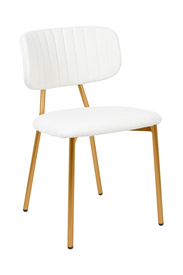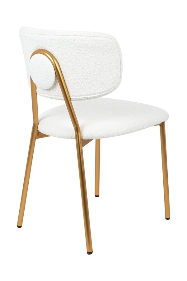 Oparcie i siedzisko tapicerowane są przyjemną, miękką w dotyku tkaniną boucle w kolorze białym.