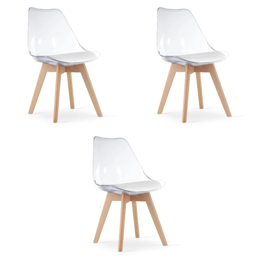 - krzesła TRANSPARENTNE z białą poduszką i bukowymi nogami w kolorze naturalnym