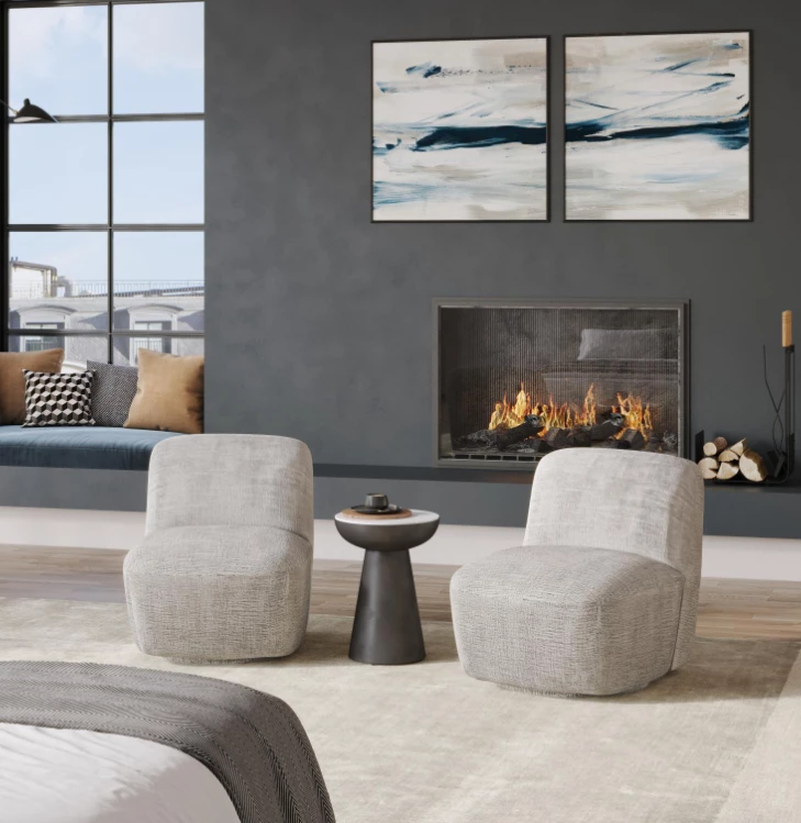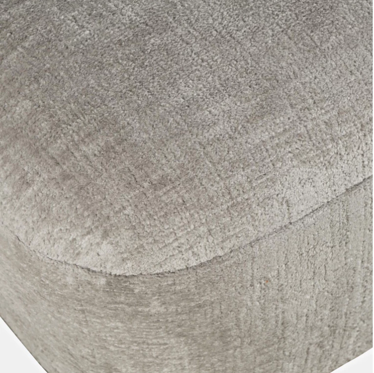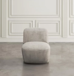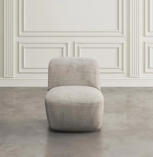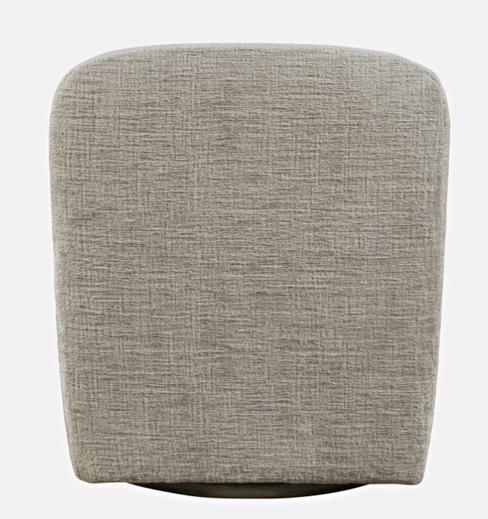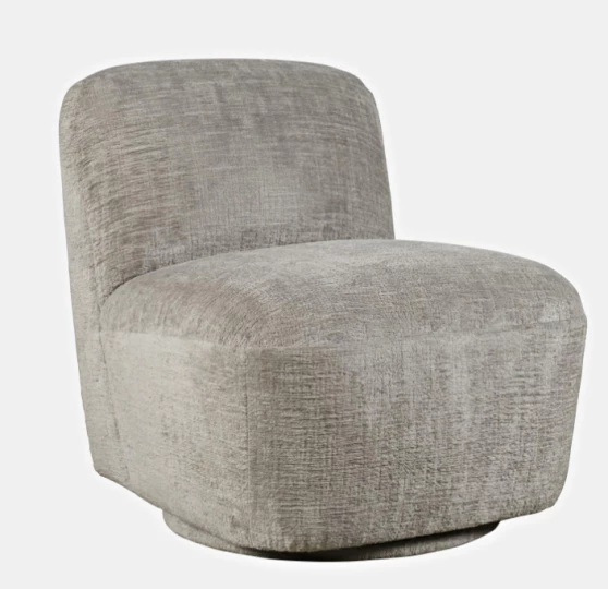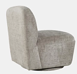 Elegancki fotel obrotowy tapicerowany w kolorze szaro beżowym wykonany z najwyższej jakości tkaniny. Prosta forma mebla oparta na modnych, obłych kształtach wzbogaci każdy salon.