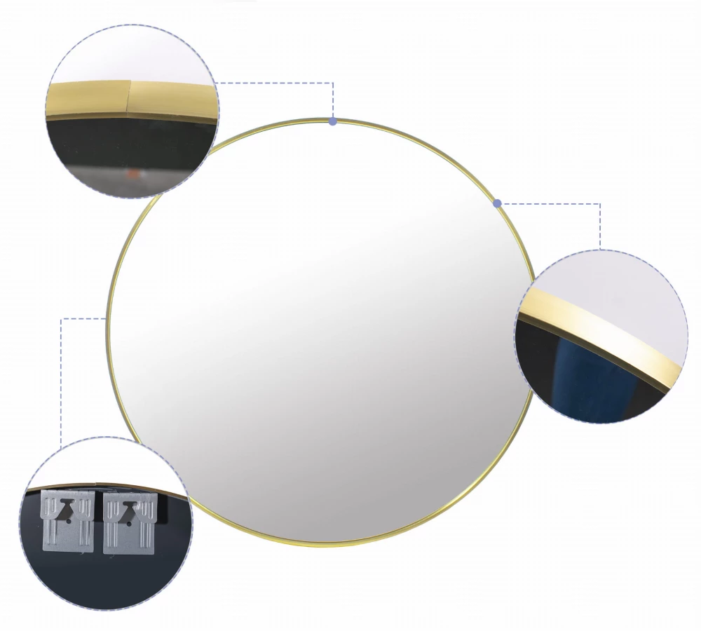 Ramę wykonano z metalu, a następnie została ona pomalowana proszkowo na złoto. Rama lustra jest łatwa w utrzymaniu czystości - wystarczy ją przetrzeć wilgotną szmatką.