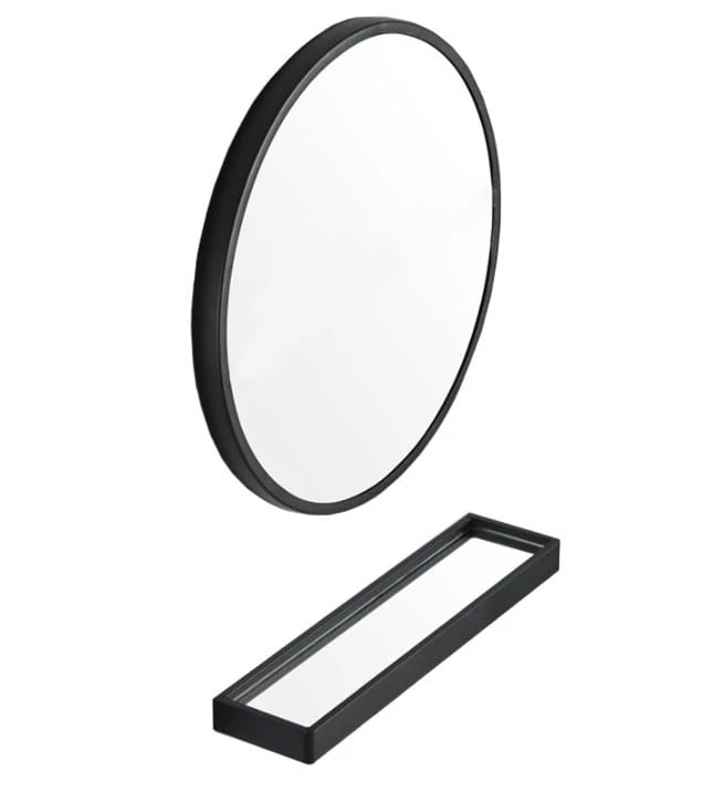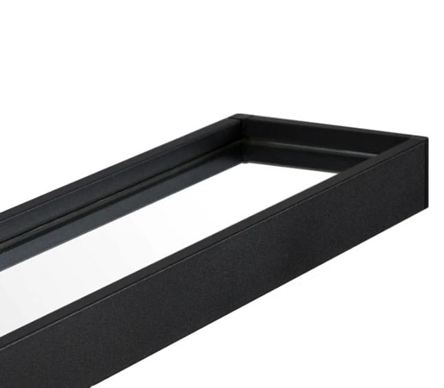 Wnętrze półki wypełnione jest taflą lustra. Rama wykonana z metalu malowanego proszkowo na czarno. Półkę oczywiście możemy wykorzystać na produkty kosmetyczne oraz przybory toaletowe. Na półce możemy również umieścić dyfuzory zapachowe.