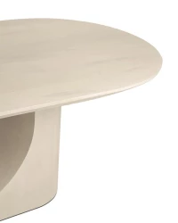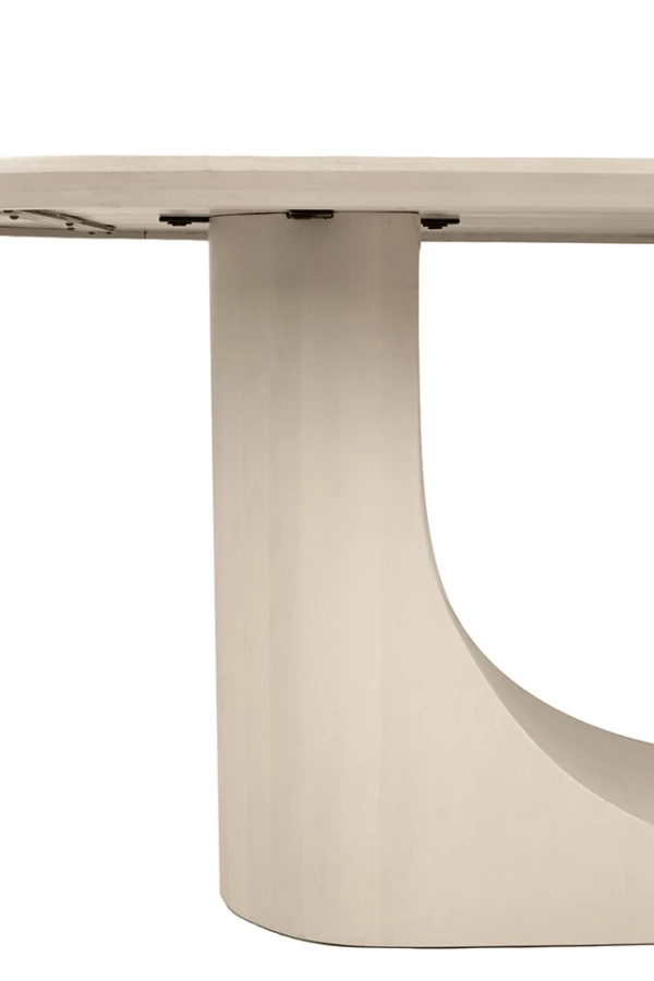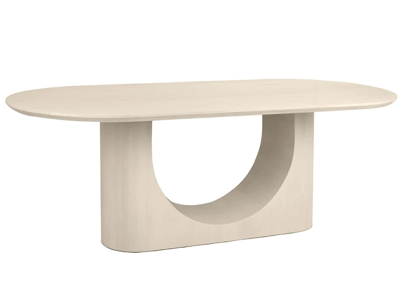 Stół w całości wykonany z drewna mango w eleganckim beżowym odcieniu, przyciąga wzrok unikalną podstawą w formie łuku, która nadaje mu lekkości i architektonicznego wyrazu. Zaokrąglony blat dopełnia całość, tworząc harmonijną i płynną linię.