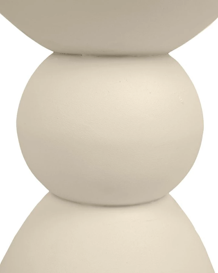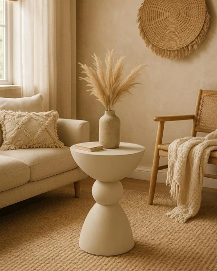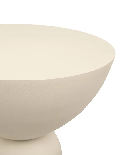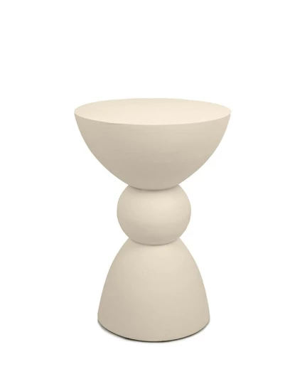 Wykonany z gładkiego MDF, zachwyca miękką linią i geometrycznym kształtem – kulista forma osadzona między stożkową podstawą a półokrągłym blatem tworzy wyjątkową, balansującą sylwetkę. Spokojna, jansnobeżowa kolorystyka idealnie komponuje się z wnętrzami utrzymanymi w stylu japandi, skandynawskim lub nowoczesnym.