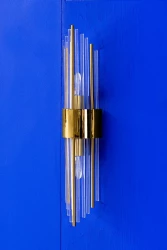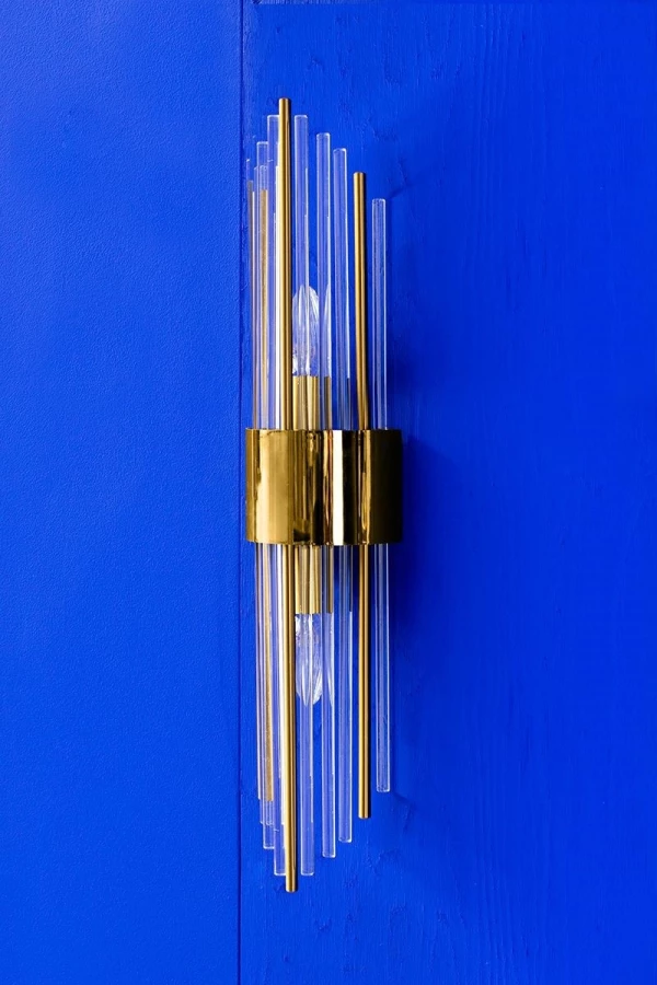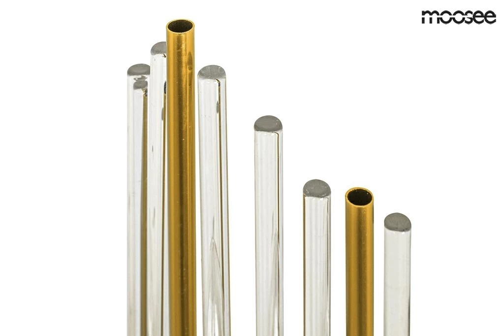 Snop światła przebija się przez transparentne klosze, a zatrzymuje na złoto-pomarańczowych rurkach, co tworzy niezwykły efekt wizualny.