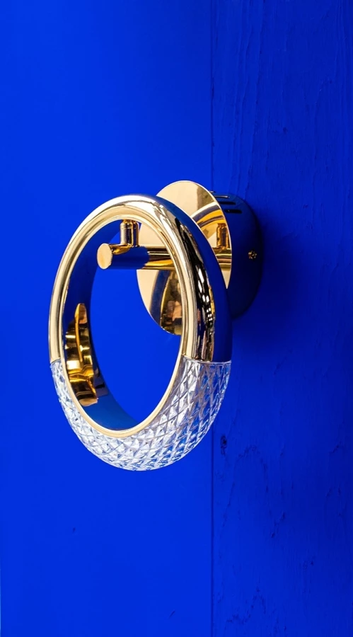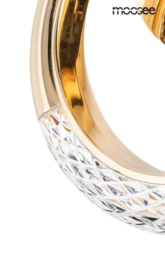 Przypominająca elegancką kołatkę oprawa została wykonana z aluminium w złotym kolorze i dekoracyjnych kryształów.