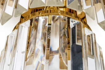 Całość zamocowana jest na złotej ramce. Półokrągły kształt kinkietu, połączenie złota i szklanych kryształków zapewniają optymalne oświetlenie pomieszczenia.