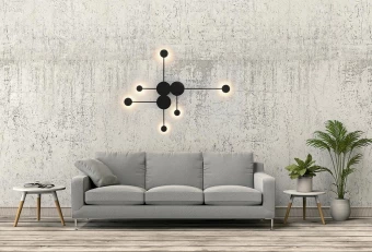 Nowoczesny kinkiet wykonany z metalu w czarnym, matowym kolorze. Okrągłe klosze o grubości 2 cm skrywają