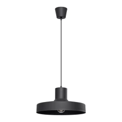 Podłużny klosz ze stali nierdzewnej o przekroju prostokąta w połączeniu z okrągłą, czarną montaturą tworzy ciekawą i nowoczesną oprawę.