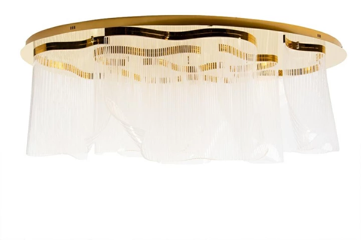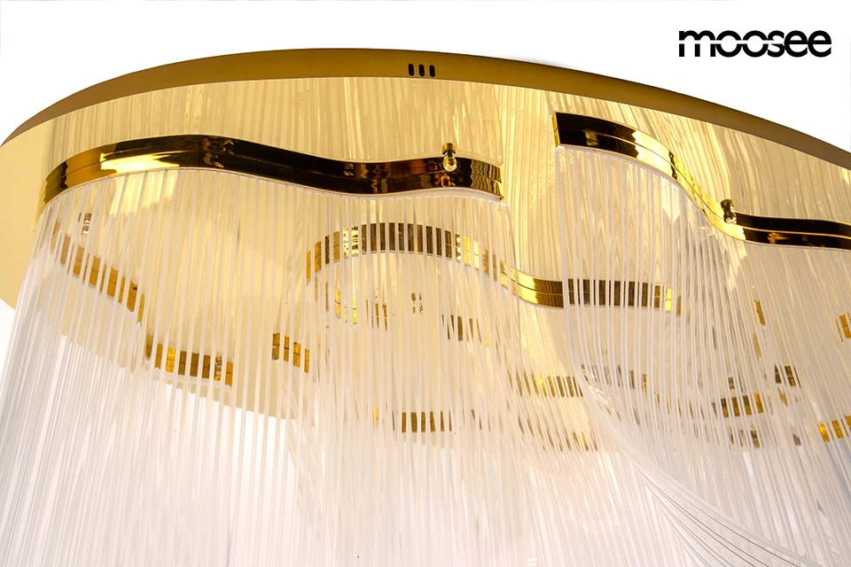Złota konstrukcja z metalu emanuje elegancją, a transparentne klosze z akrylu układają się w delikatne fale, tworząc efekt lekkiej, świetlistej zasłony.
