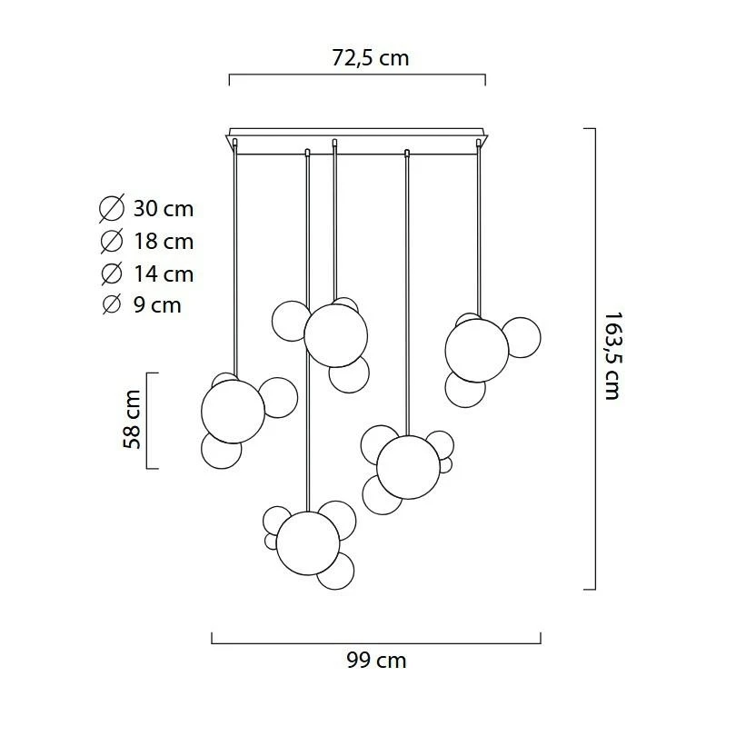 Pięć głównych kul zawieszonych zostało na przewodach, wychodzących z jednej podsufitki.