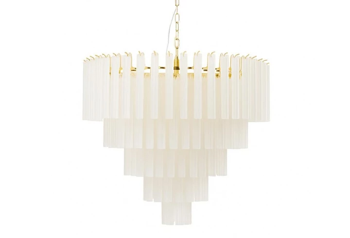 Wykonana ze stali, z kloszami z mlecznobiałego, matowego szkła, lampa subtelnie rozprasza światło, wprowadzając do wnętrza ciepły i przytulny nastrój.