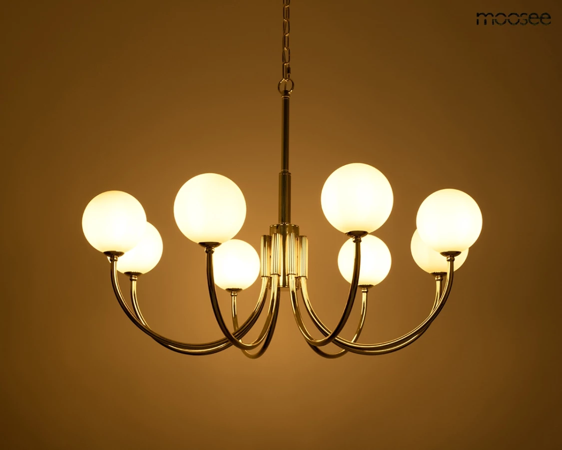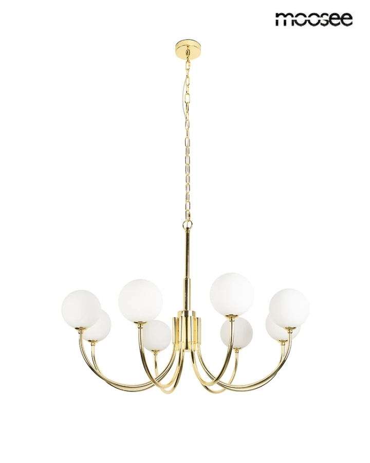 Złota metalowa rama wspiera kuliste, mleczne szklane klosze, tworząc efektowną i nowoczesną formę.