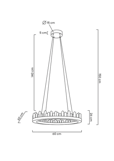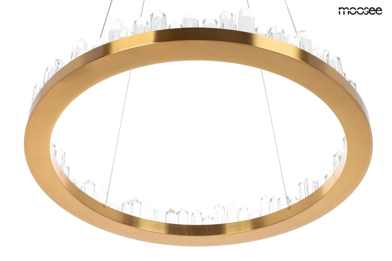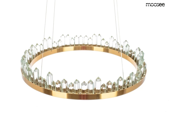 Ledowe źródło światła umieszczone na całym okręgu, rozświetla kryształy, tworząc świetlne refleksy o ciepłej barwie.