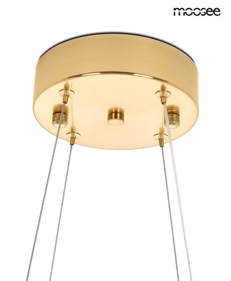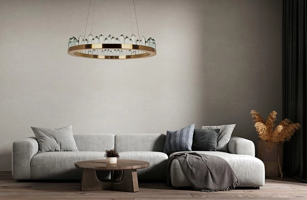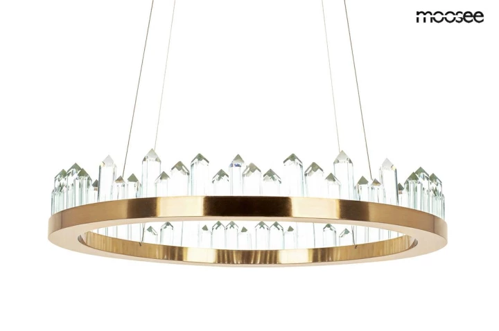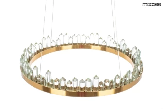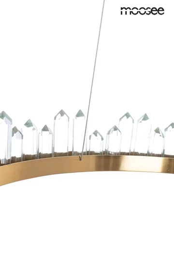 Okrągły kształt lampy, połączenie złota i kryształów zapewniają wyjątkowe oświetlenie pomieszczenia.