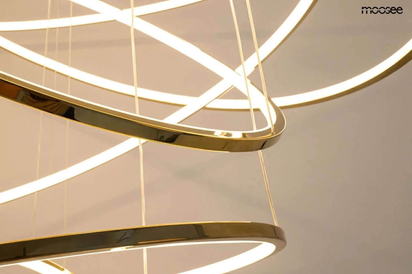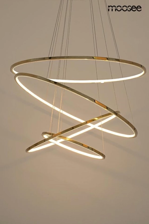 Ringi wykonano ze stali w połyskującym złotym kolorze, a źródła światła z akrylu.