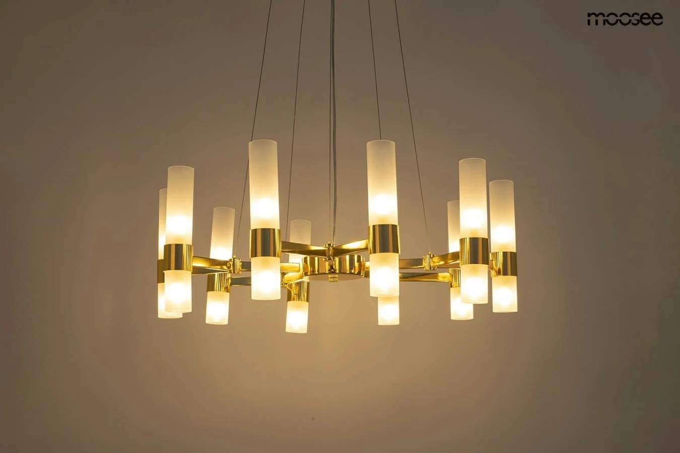 Imponująca konstrukcja składa się z 20 eleganckich, białych szklanych kloszy, które subtelnie rozpraszają światło, tworząc przytulną i elegancką atmosferę.