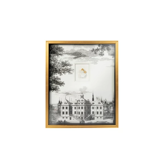 Obraz przedstawia spokojny krajobraz z pięknym pałacem, emanujący relaksującą i szykowną atmosferą.
