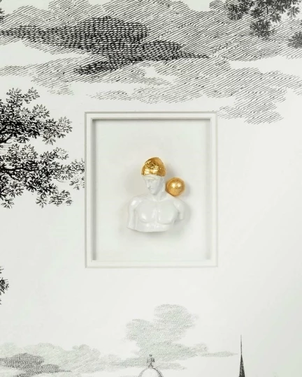 W centrum kompozycji umieszczono rzeźbę kobiety ze złotym akcentem, która dodaje nowoczesnego charakteru i przyciąga uwagę.