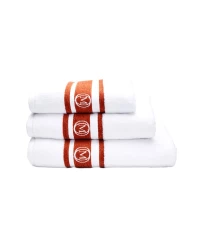 Ręcznik do rąk z białej organicznej bawełny frotte z żakardowymi kolorowymi paskami w aksamitnym splocie chenille. Bawełna odwójnie czesana, wstępnie prana. Ręcznik posiada wszytą pętelkę do zawieszania w tym samym kolorze, podwójne przeszycia i zamknięte rogi.