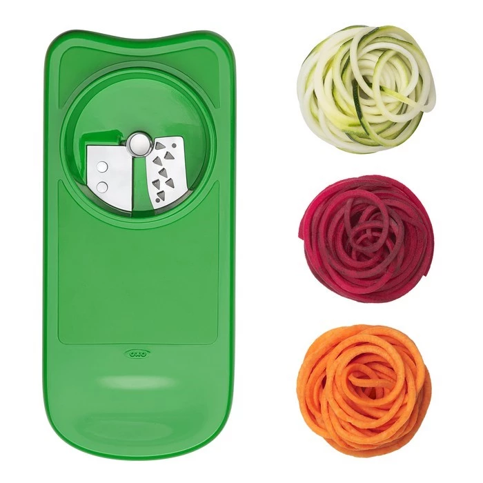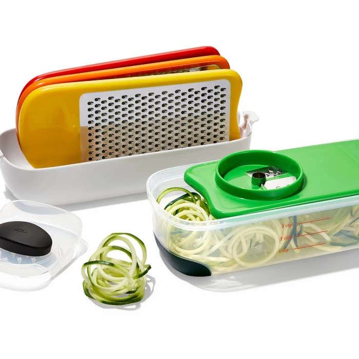- w komplecie tarka spiralna do przygotowania warzywnego spaghetti, plastrownica oraz tarki o grubych i drobnych oczkach,