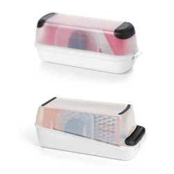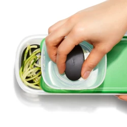 - do zestawu dołączone są pojemnik z antypoślizgowymi elementami, pokrywka oraz uchwyt do przytrzymywania warzyw,