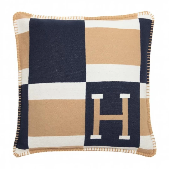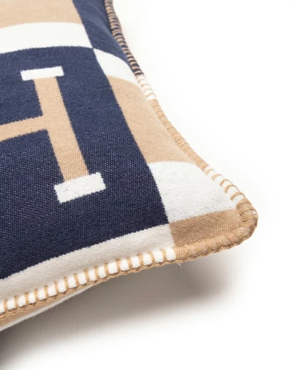 Geometryczny wzór z literą "H" oraz ozdobne, kontrastowe granatowo-szare obszycie dodają charakteru i stylu.