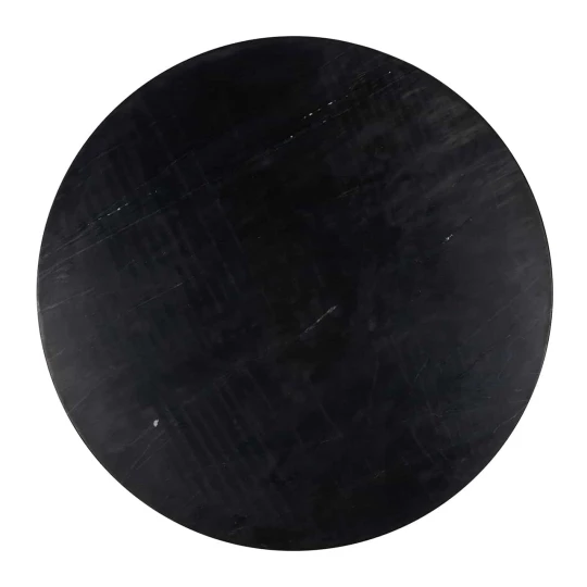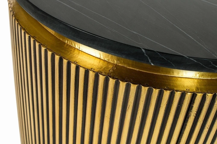 Okrągły blat z grubego, czarnego marmuru świetnie komponuje się z mosiężnym korpusem.