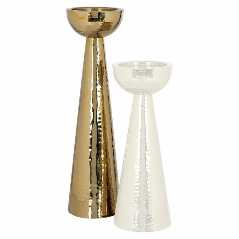 Klasyczna, ponadczasowa forma świecznika w złotym błyszczącym wydaniu.