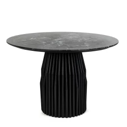 Okrągły blat wykonany z konglomeratu imitującego marmur zachwyca subtelnym rysunkiem kamienia i nadaje wnętrzu ponadczasowy charakter.