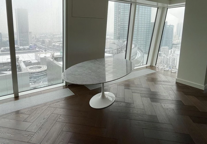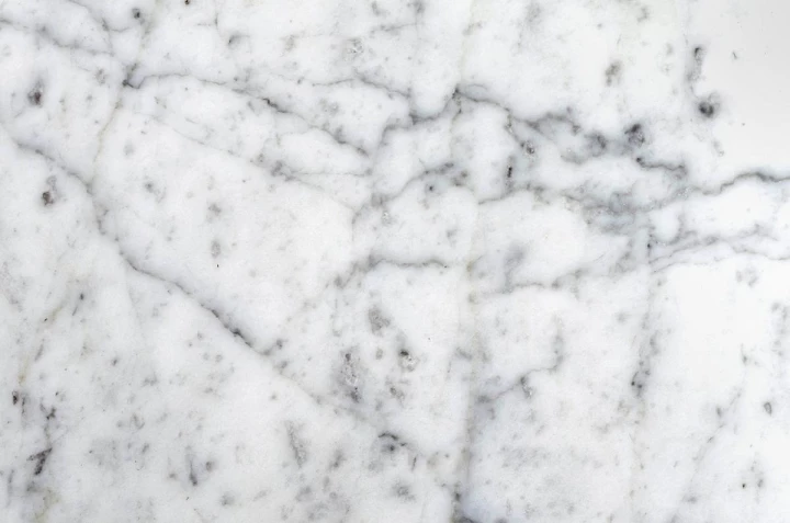 Owalny blat z włoskiego marmuru Bianco Carrara w jasnym odcieniu zachwyca naturalnym rysunkiem kamienia i eleganckim wykończeniem.