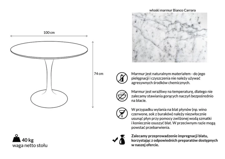 Stół TULIP MARBLE 100 CARRARA biały - blat okrągły marmurowy, metal