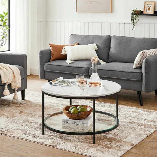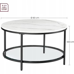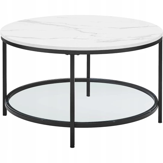 Stolik wykonany w stylu nowoczesnym. Odpowiednie wymiary stolika zapewniają wystarczająco dużo miejsca na filiżanki do kawy, laptop, pilot do telewizora oraz tacę z przekąskami. Dodatkowym atutem stolika jest szybkość jego złożenia. Produkt błyskawicznie się składa co czyni go niezwykle pomocnym również w awaryjnych sytuacjach np. gdy potrzebujemy dodatkowego miejsca na przekąski czy ciasta, a na głównym stole w jadalni nie zmieści się już nic więcej. Uniwersalność oraz praktyczność sprawią, że ten stolik będzie jednym z Twoich ulubionych mebli w domu. Okrągłe stoliki czy ławy cieszą się szczególną popularnością w domach, gdzie przebywają małe dzieci, gdyż nie ma obawy, że dziecko uderzy się o kant blatu. Stolik na pewno wpasuje się w wystrój niejednego pomieszczenia. Stalowa konstrukcja zapewnia stabilność mebla. Idealnie spasowane elementy ramy oraz nowoczesna oprawa blatu i szklanej półki nadadzą Twojemu wnętrzu wdzięku. Zadbaj o estetykę swojego salonu, pokoju dziennego, czy sypialni wybierając produkty sprawdzone, o najwyższej jakości wykonania.